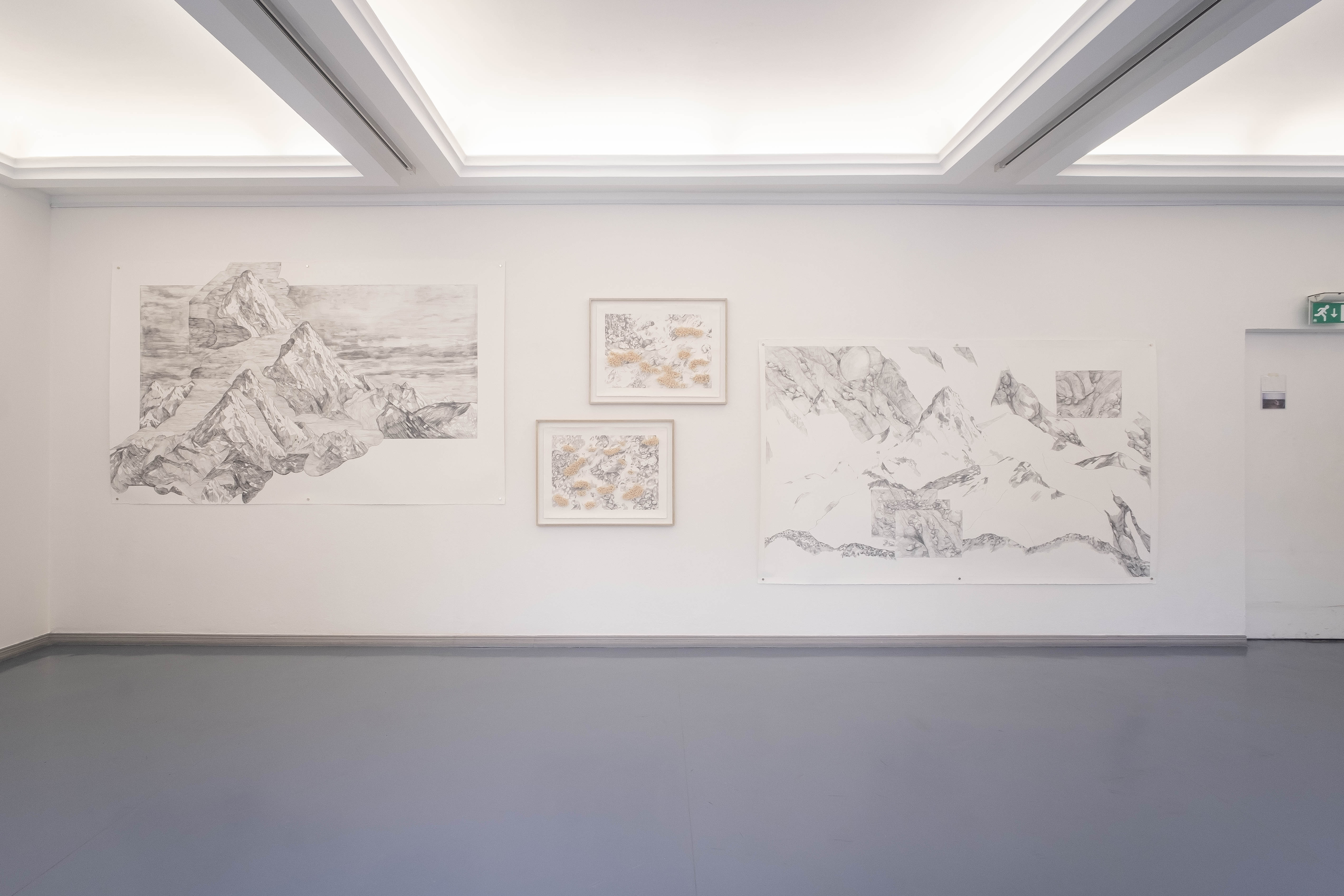 Landschaftsbilder in von Hand gefertigte Einzelstücke. Nicht die Berge selbst, sondern ihre Abbildungen, wie sie etwa in der Werbung verwendet werden, sind Ausgangspunkt für ihre Reflexion darüber, was wir von Landschaft erwarten. Sie verbindet ihre Zeichnungen mit der Ästhetik digitaler Gesten, indem sie etwa ihre Bergpanoramen mit dem Photoshop-Radierer von menschlichen Spuren befreit oder verschiedene Ebenen übereinander legt. Der analoge, zeitintensive und zuweilen auch kontemplative Ansatz des Zeichnens trifft hier auf sein nervöses Gegenstück: das Leben mit zu vielen geöffneten Tabs, die als Ausschnitte einer Wirklichkeit unablässig um unsere Aufmerksamkeit konkurrieren.