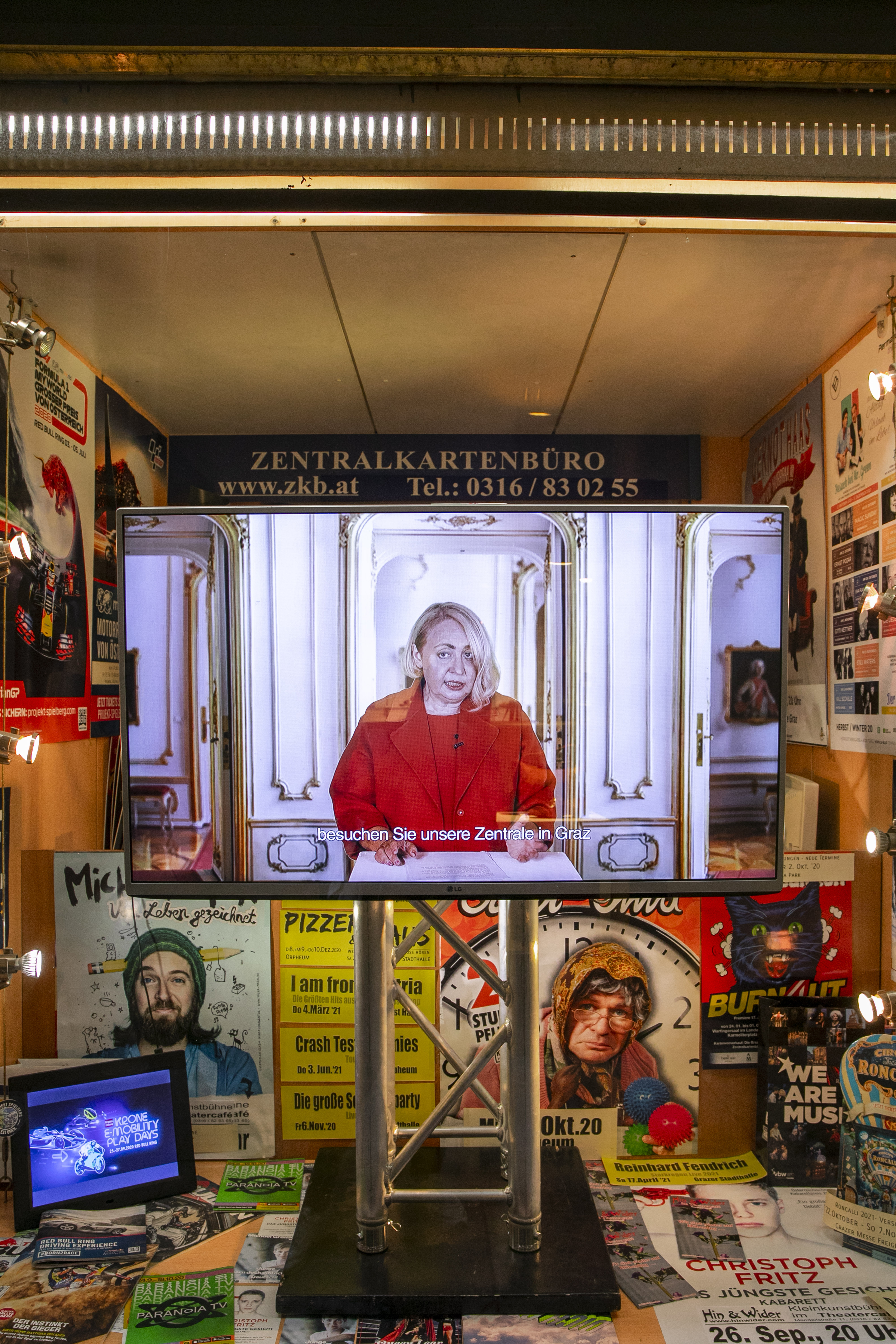 socially distanced in front of the Orpheum theatre in Graz. At the